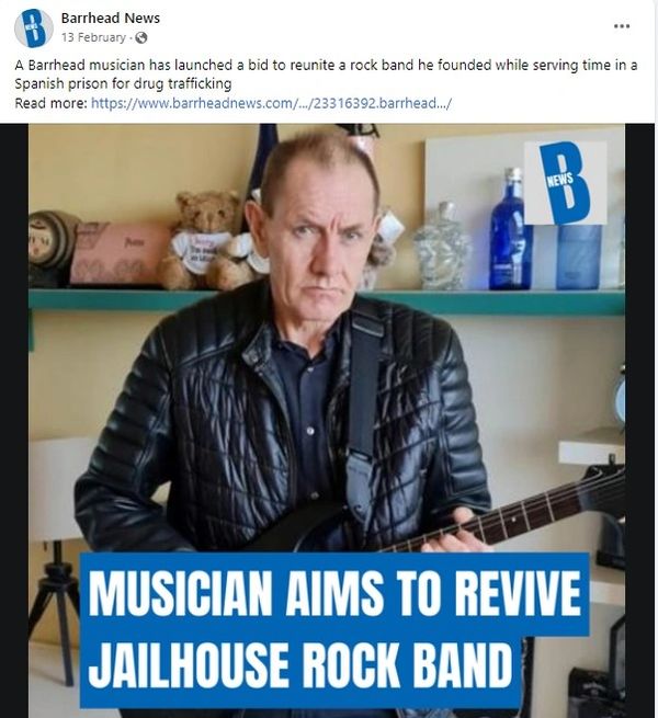 Un músico de Barrhead ha lanzado una apuesta para reunir a una banda de rock que fundó mientras cumplía condena en una prisión española por tráfico de drogas.